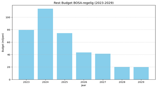 Wel kan naar eerdere jaren worden gekeken. In 2023 bedroeg het BOSA-budget bijna € 85 miljoen. In dat jaar werden circa 4.000 aanvragen ingediend, met een gemiddeld subsidiebedrag van € 21.341.